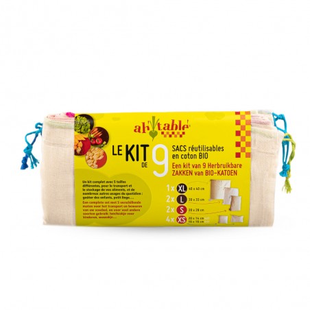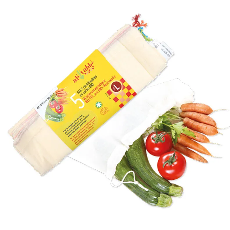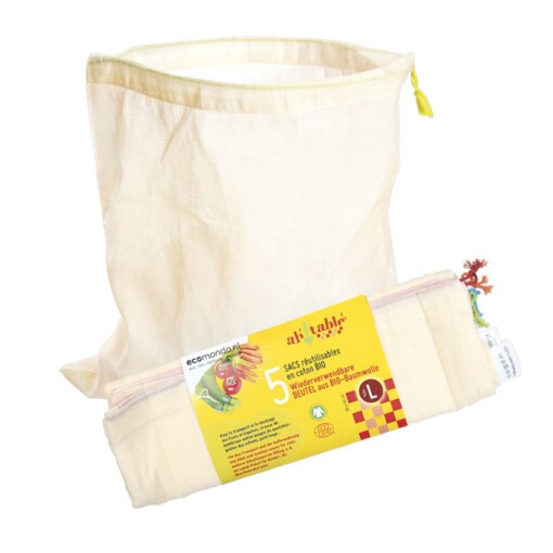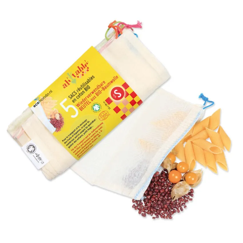 Op naar de winkel of markt met je eigen herbruikbare fruit- en groentezakken van Ah!Table! Losse appels, peren, tomaten, avocado’s, aardappels en zo voorts, kun je goed verpakken, vervoeren en bewaren. Er zijn verschillende setjes van biologisch katoenen zakjes: verpakt per 3, 5, 8 of 9 stevige groentezakken in diverse maten. Wasbaar op max. 30 graden. Bij heet wassen, kunnen de katoenen zakken krimpen.
