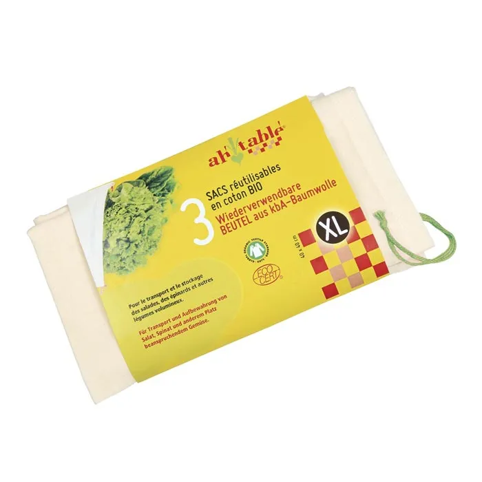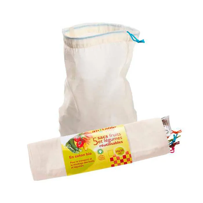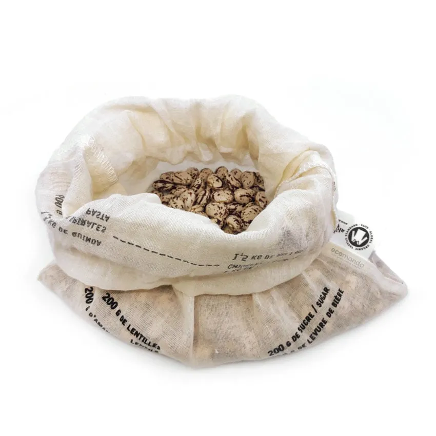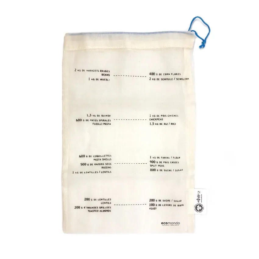 Onderhoud: Je kunt de herbruikbare katoenen zakken wassen in de wasmachine op 30°. Bij voorkeur met een ecologisch wasmiddel. Gebruik geen wasverzachter.