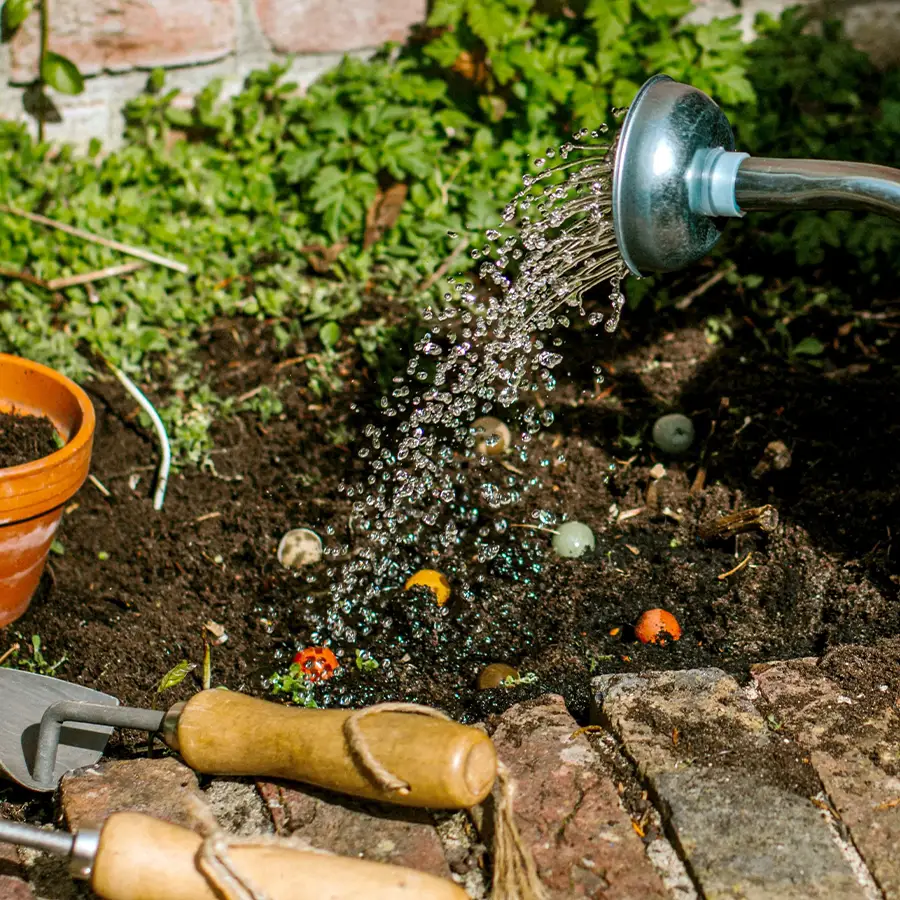 Let erop dat er geen “slimme” vogels (kraaien, eksters en kauwen) in de buurt zijn op het moment je de Blossombs wilt planten. Als je namelijk rondloopt en dingen op de grond neerlegt in het zichtveld van zo’n slimme vogel, dan kun je er zeker van zijn dat ze het zullen bekijken (en meenemen) kort nadat jij weg bent! Plant de Blossombs als de grond vochtig en zacht is en duw ze vervolgens met je schoen zachtjes in de aarde. Let op: zeker niet volledig ingraven (!), maar bedek ze eventueel met een beetje riet, boomschors of een paar blaadjes.