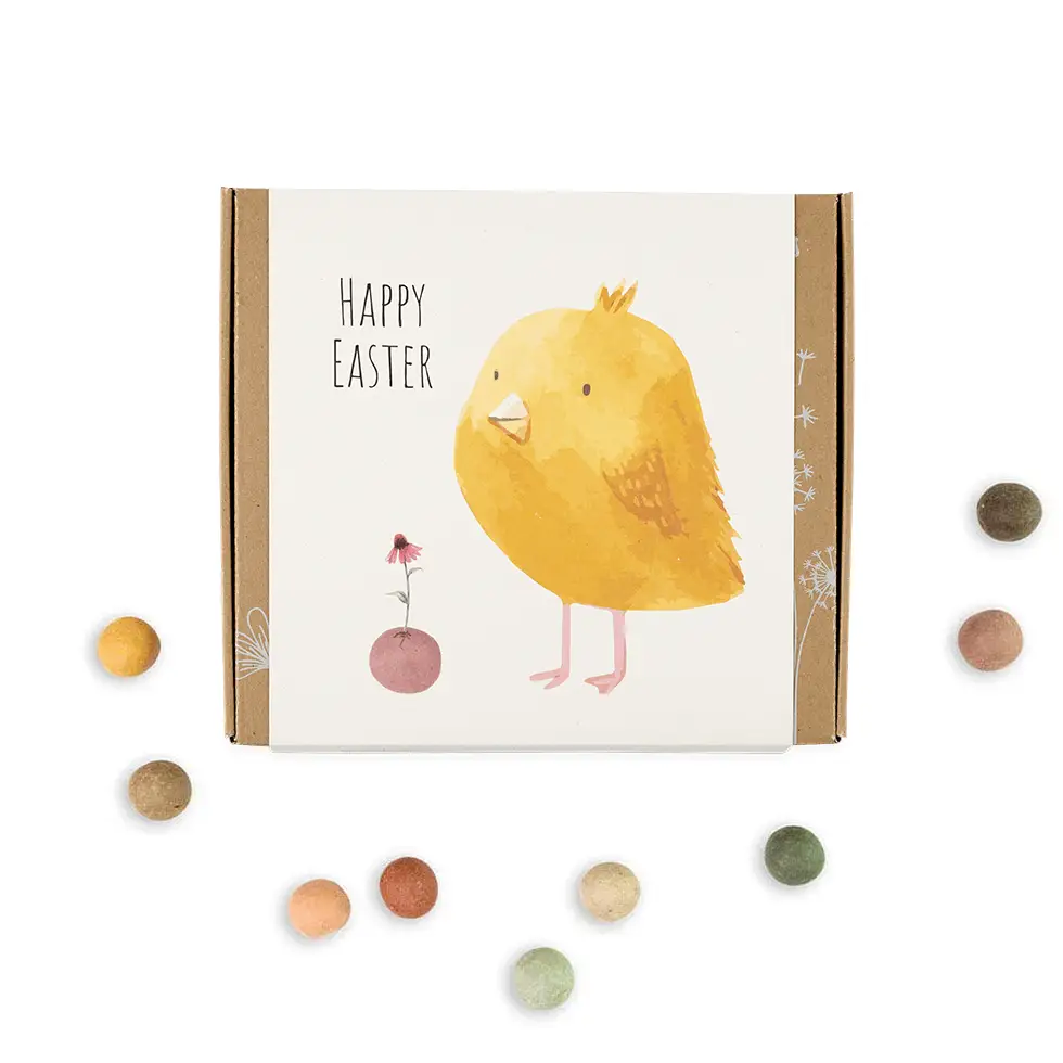 Wij hebben een giftbox Medium (9 zaadbommen) met paas sleeve en een Blossombs wenskaart met zaadbom.