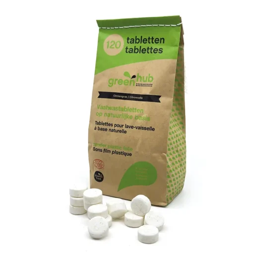 Voordelige, eenvoudige volumeverpakking met maar liefst 120 eco vaatwastabletten, daarmee kun je flink besparen. Deze GreenHub plasticvrije vaatwastabletten maken het makkelijk om zuinig met je vaatwasmiddel om te gaan. Tegelijkertijd is het fijn om te weten dat deze vaatwastabletten 100% plasticvrij zijn. Dus geen verstopte plastics zoals folie of bindmiddellen. Goed voor de vaat en het milieu, de tabletten zijn niet geparfumeerd, niet in plastic verpakt en ze zijn iets kleiner dan de meeste andere vaatwastabletten. Ook jouw afwas wordt sprankelend schoon, hardnekkige vlekken worden moeiteloos verwijderd.