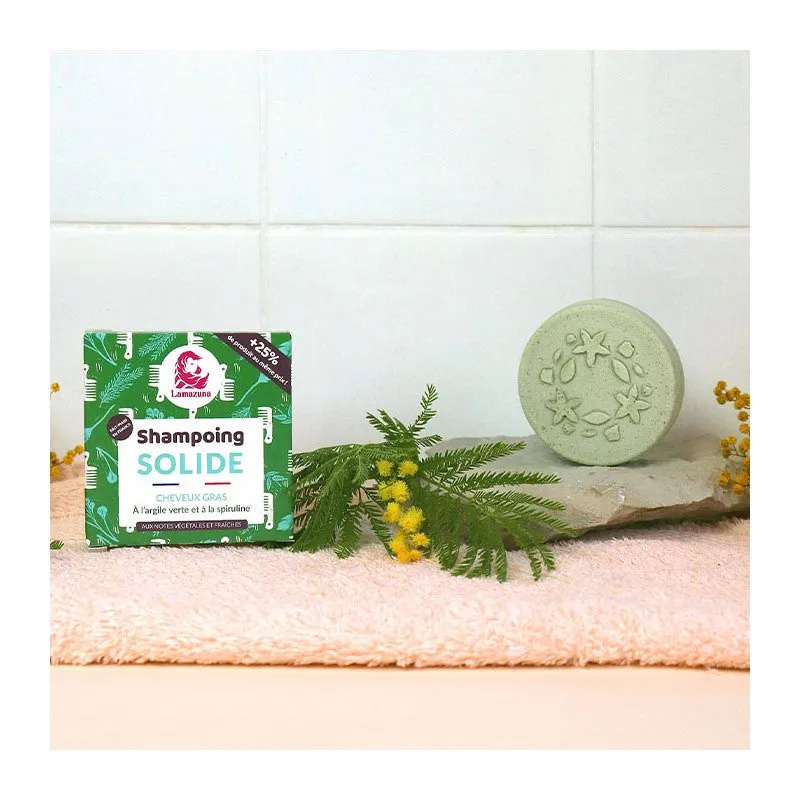 Shampoo bar voor vet haar. Een boost van frisheid onder de douche! Je haar wordt gezuiverd en wordt minder snel opnieuw vet dankzij de groene klei. Het extraatje is spirulina, dit versterkt je haar.