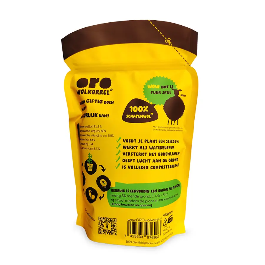 ORO wolkorrels zijn volledig natuurlijk en biologisch afbreekbaar. De wol wordt door ORO in hun eigen fabriek in Haarlem verwerkt tot wolkorrels en met de hand ingepakt. Schapenwolkorrels of wolpellets zijn toegestaan in de biologisch en biologisch dynamische landbouw.