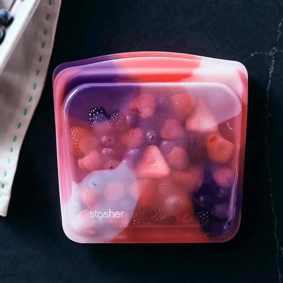 Stasher Bag is ideaal voor het verpakken van etenswaren. Denk aan boterhammen of het invriezen van vlees, vis of groenten zonder plastic zakjes. Je kunt er ook heel makkelijk een stuk kaas in bewaren of tomaatjes in meenemen. Wil je iets ontdooien? Dan kun je de Stasher dicht in een pan met wat handwarm water doen.