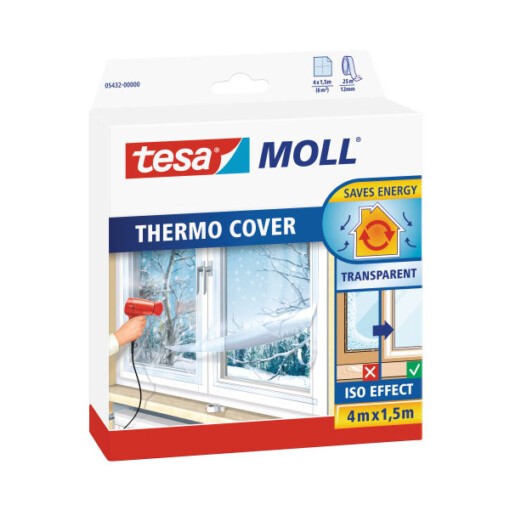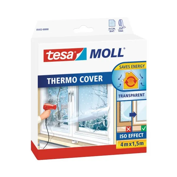 Neem maatregelen voor het geval de kou toeslaat. Bereid je voor op mogelijke kou en hogere energieprijzen. Met Tesa Thermo Cover Raamisolatiefolie kun je direct energie besparen! Aanbrengen is eenvoudig. Met de bijgeleverde transparante, dubbelzijdige tape is de isolatiefolie eenvoudig en vrijwel onzichtbaar aan te brengen aan de binnenkant van het kozijn of op de raamsponning. Na het aanbrengen zorgt de warmte van een haarföhn ervoor dat de folie krimpt en zich strak spant tussen de raamsponningen. Met deze kozijnfolie maak je van enkel glas als het ware dubbel glas omdat je een isolerende spouwruimte creëert.